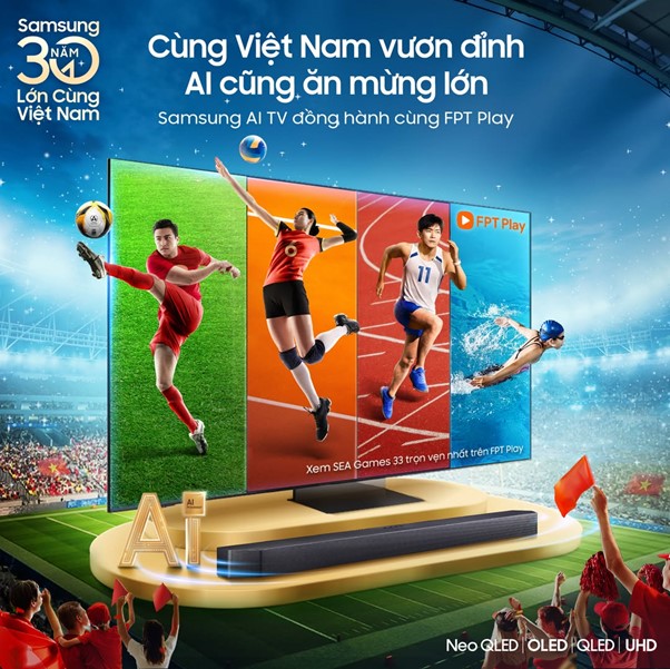 SEA Games 2025 diễn ra cùng lúc với thời điểm kỷ niệm 30 năm phát triển tại Việt Nam của Samsung. Ông lớn Hàn Quốc đã sẵn sàng cùng thể thao Việt Nam viết tiếp những kỳ tích thể thao mới tại đấu trường khu vực thông qua công nghệ âm thanh, hình ảnh đỉnh cao trên Samsung AI TV 2025.