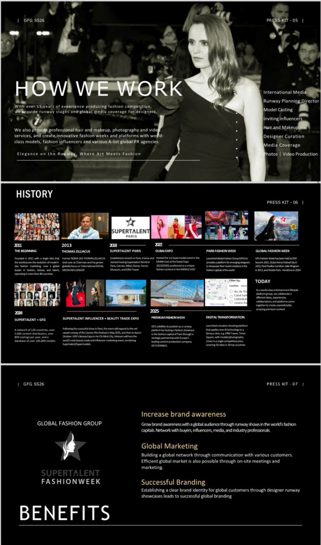 Supertalent of the World được thành lập năm 2011 bởi ông Lawrence Choi, cựu lãnh đạo Elite Model Management Seoul. Sau hơn một thập kỷ phát triển, Supertalent đã trở thành nền tảng quốc tế hàng đầu trong lĩnh vực thời trang, sắc đẹp và tài năng, hiện diện tại hơn 80 quốc gia, kết nối 120 quốc gia, với cơ sở dữ liệu hơn 100.000 người mẫu. Năm 2019, tổ chức này ra mắt Global Fashion Group (GFG) nhằm hỗ trợ các nhà thiết kế trẻ trình diễn bộ sưu tập tại những kinh đô thời trang lớn như Paris, Milan hay Dubai. Chỉ tính riêng năm vừa qua, GFG đã giới thiệu hơn 50 nhà thiết kế tài năng trên sân khấu toàn cầu, tạo điều kiện để họ bước ra thị trường quốc tế.